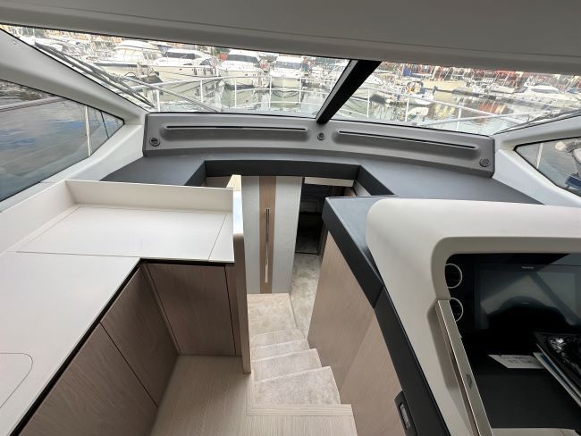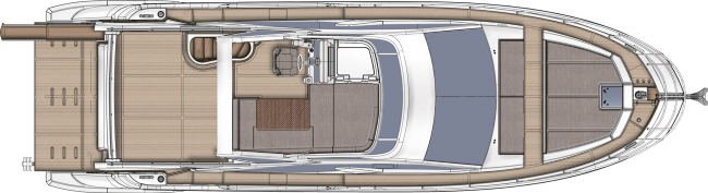 The largest flybridge you can get on for the size of boat, ergonomically laid out with seating to the rear in the sun, wet bar and dining area under the T Top protection opposite the helm