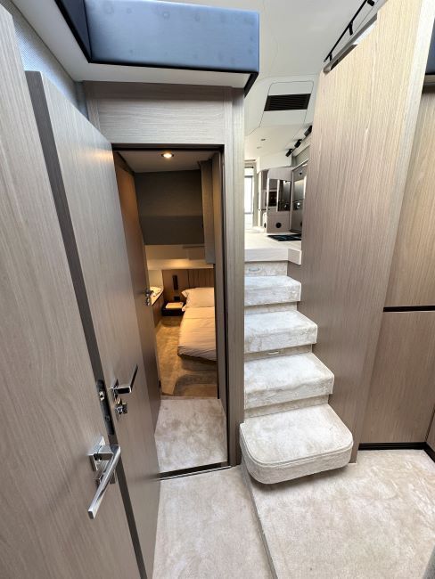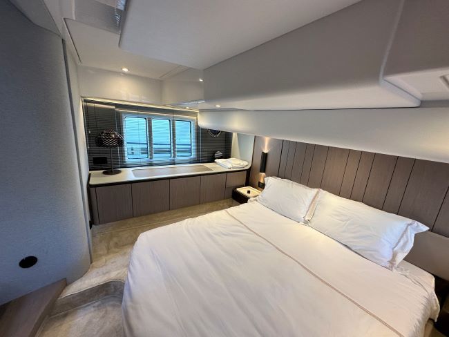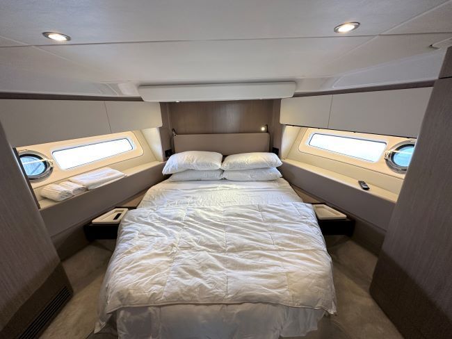 Forward VIP guest cabin with large double island berth, storage with en-suite access to day head