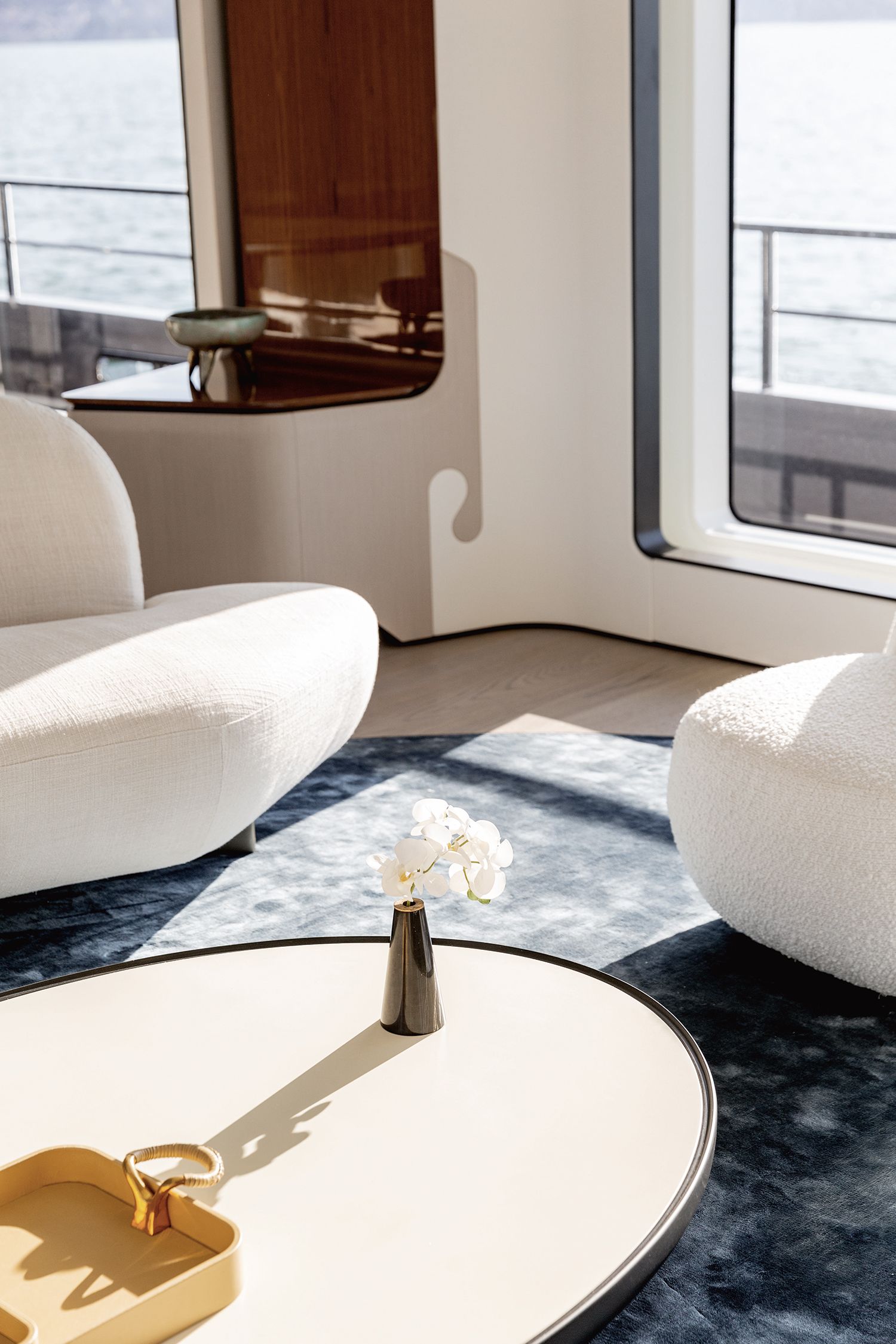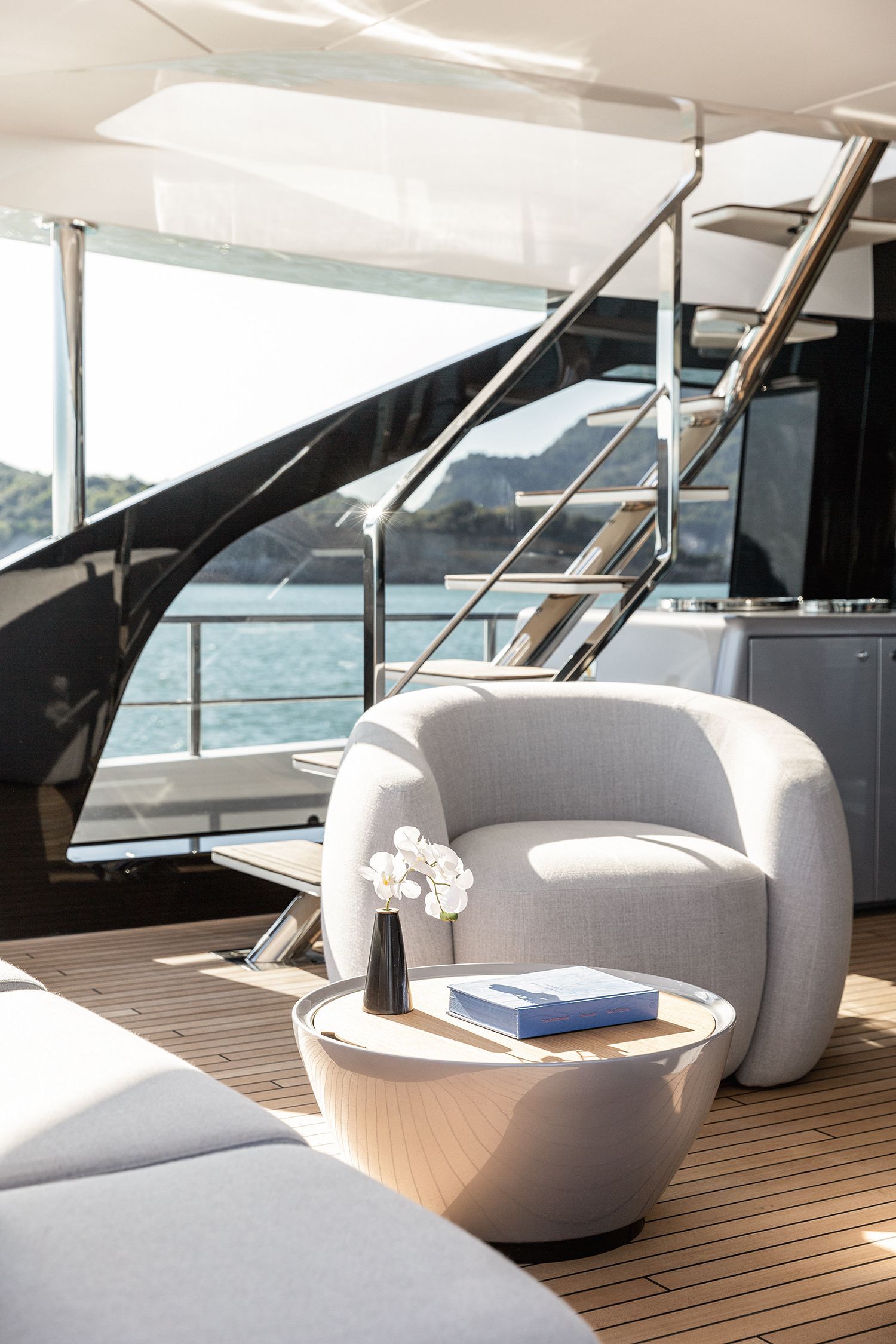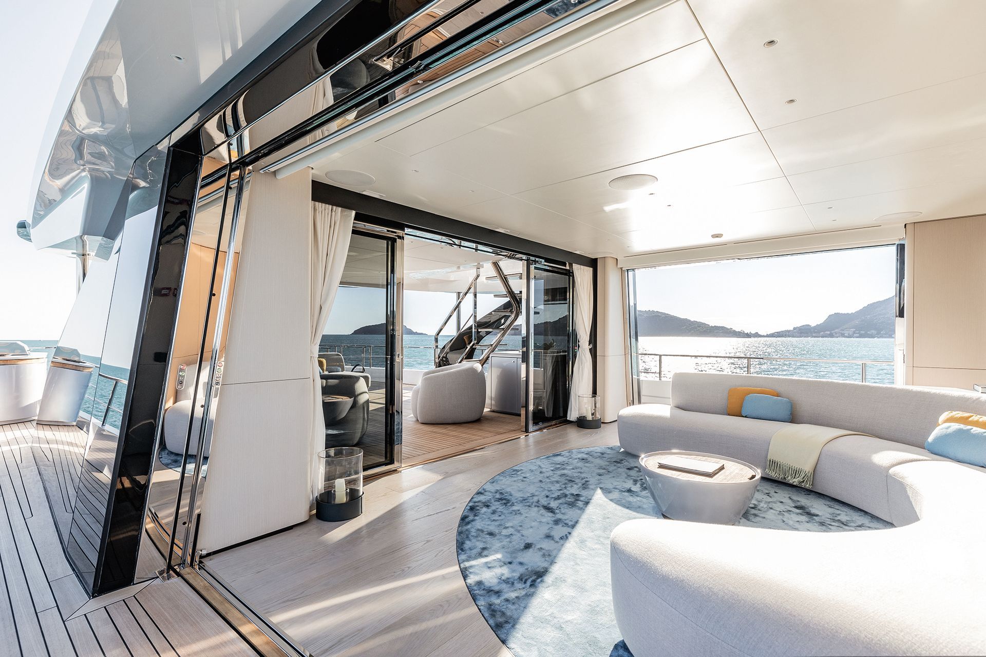 With her original design and modern ethos, the Azimut Grande 36M is a superyacht that synthesizes cutting- edge style and attitude. From the unprecedented semi- walkaround upper deck inspiring freedom of movement to the fully retractable side windows posing a special gateway to the sea, all elements contribute to visually blend interior and exterior spaces. A barrierless lifestyle naturally blurs the boundaries between onboard pleasure and oceanic greatness