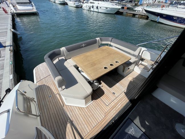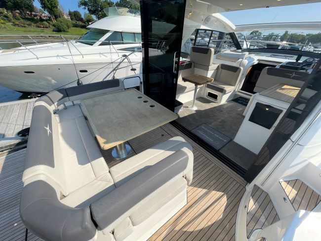 The Bavaria Sport 400 Coupe offers a spacious C shaped saloon to port, upholstery in cream leather with table, storage overhead and below, opposite fully equipped galley complete with upgraded ceramic hob and combination oven, cutlery and crockery, plenty of storage and a 22” LED TV with side loading DVD player.