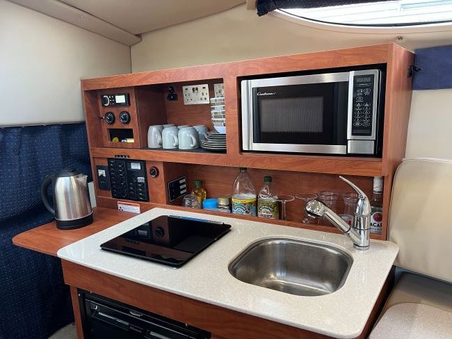 Fully equipped galley to port complete with fridge, s/steel sink, microwave and dual alcohol and electric hob with plenty of storage