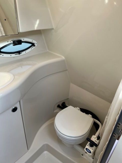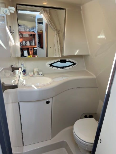 Separate head to starboard with manual sea toilet (with holding tank), sink with H&C pressurised water