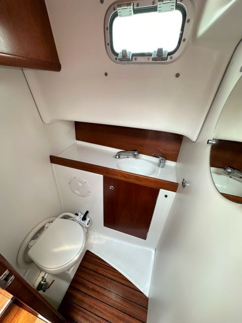Heads compartment with Jabsco marine sea toilet, shower and wash hand basin.