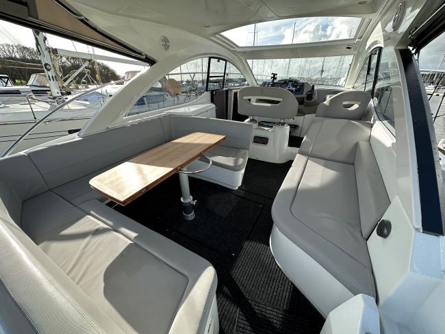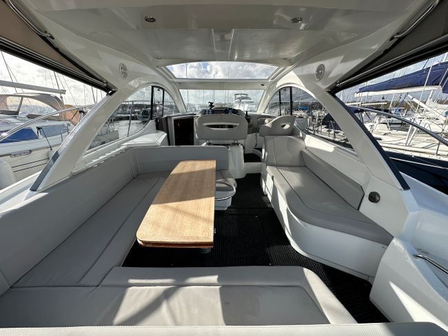 Cockpit with electronic opening hard top, three forward facing seats for helm and co-pilot, U-shaped seating around wooden table that converts to sun pad, wetbar with sink, BBQ and fridge.