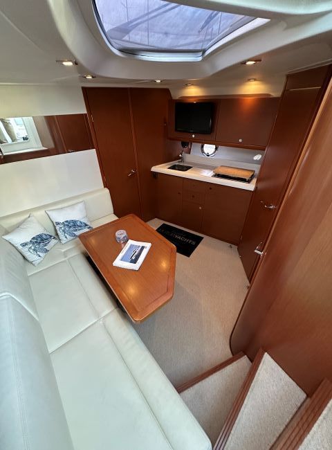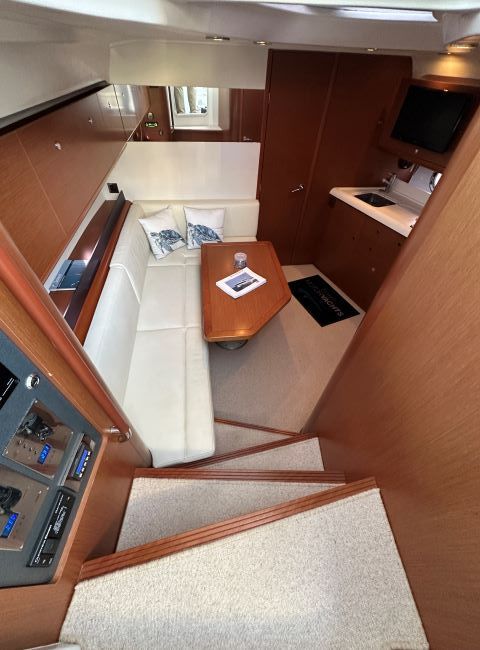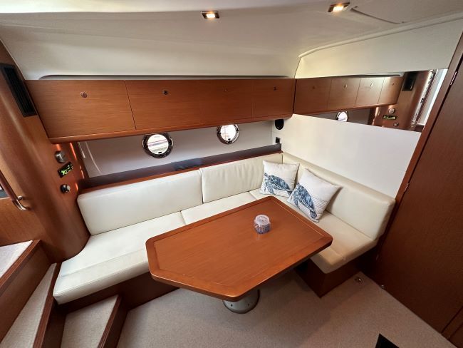 Saloon with L-shaped seating to port around table that can convert to a double berth if required, overhead storage cupboards and Flatscreen TV.