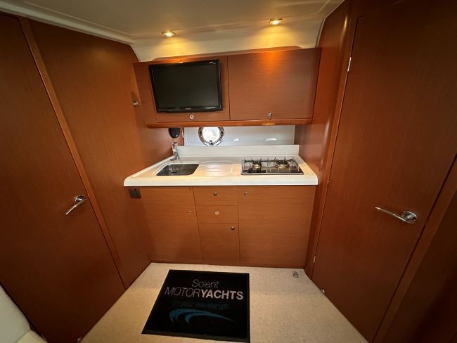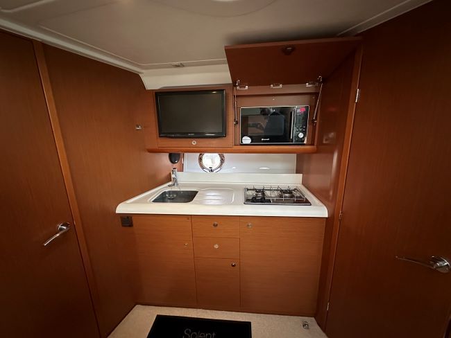 Linear galley to starboard with stainless steel sink with hot and cold mixer taps, Eno 2-burner gas hob, Waeco fridge, Brandt combination microwave/grill and storage.
