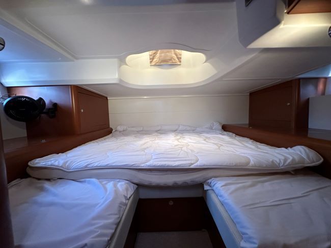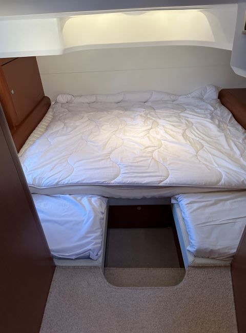 Guest cabin aft with two single berths (convertible to a double) with marine mattress, storage cupboards, opening hatch and gas monitor.