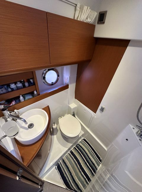 Heads located aft to starboard, with quiet flush electric toilet, sink and separate shower and storage cupboards.