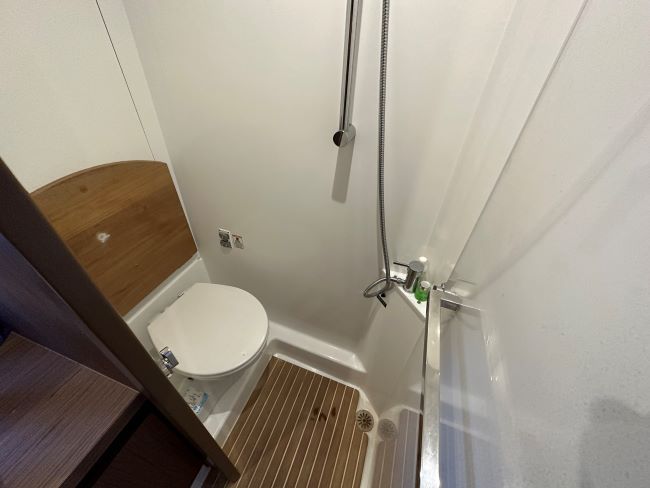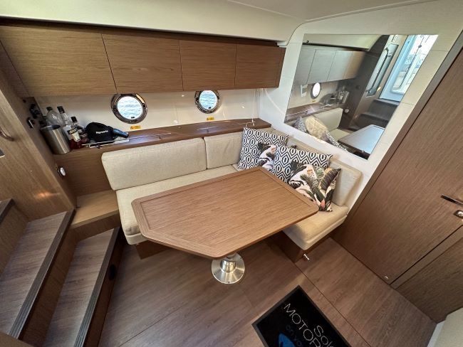 4 person 'L' shaped sofa port side, converts to double berth using saloon table and infill cushion