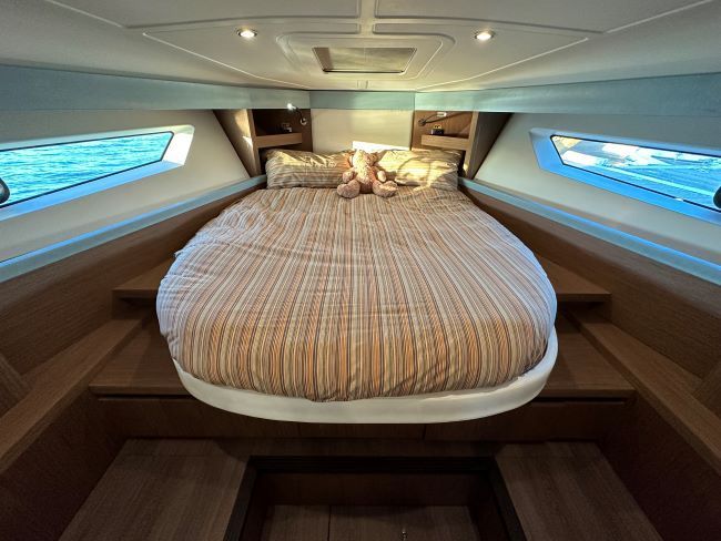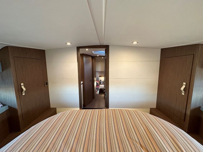 Double island berth with marine mattress and padded headboard (1.4m x 2m, 4'7" x 6'7")