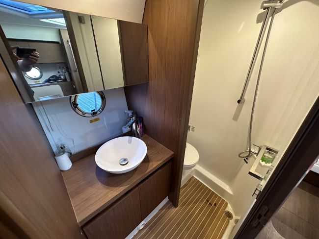 Basin with mixer tap, mirror, storage cupboards and opening porthole