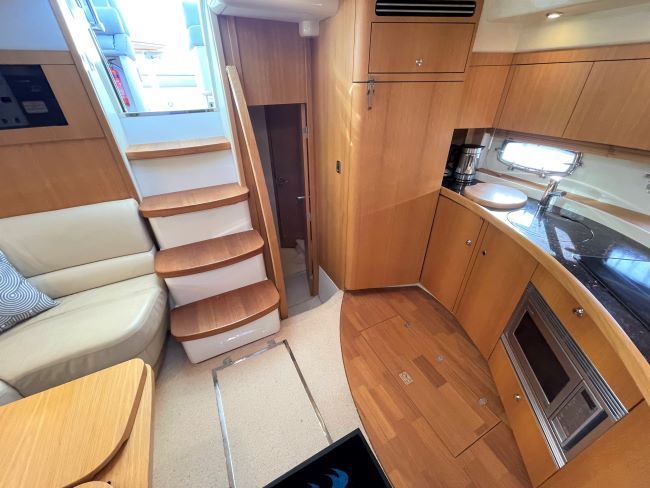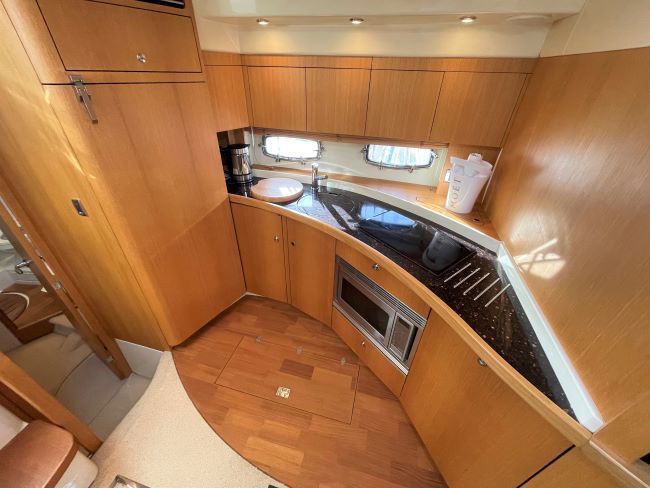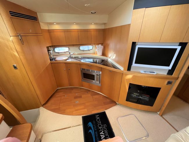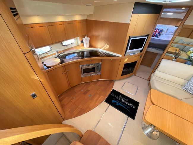 Fully-equipped galley to port with the entertainment unit forward complete with flatscreen TV, JVC radio/CD/DVD player and multidisc changer.