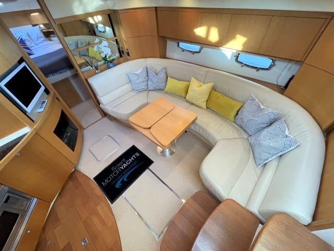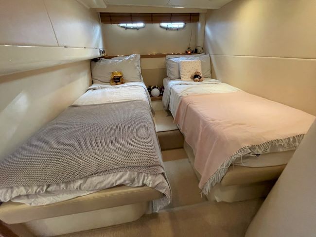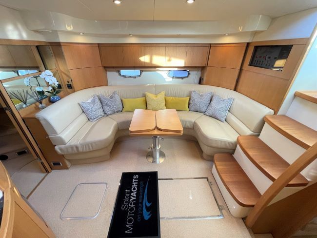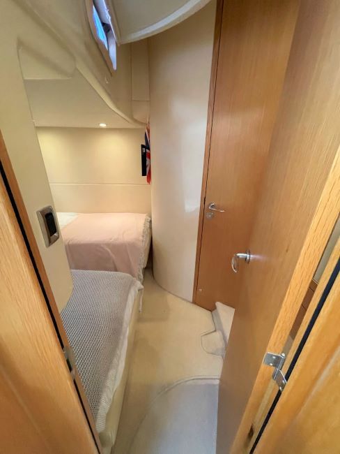 Spacious saloon to starboard (converts to a double as and when required) upholstered in stylish cream leather with the contemporary oak interior woodwork and cream carpets with overlays throughout.