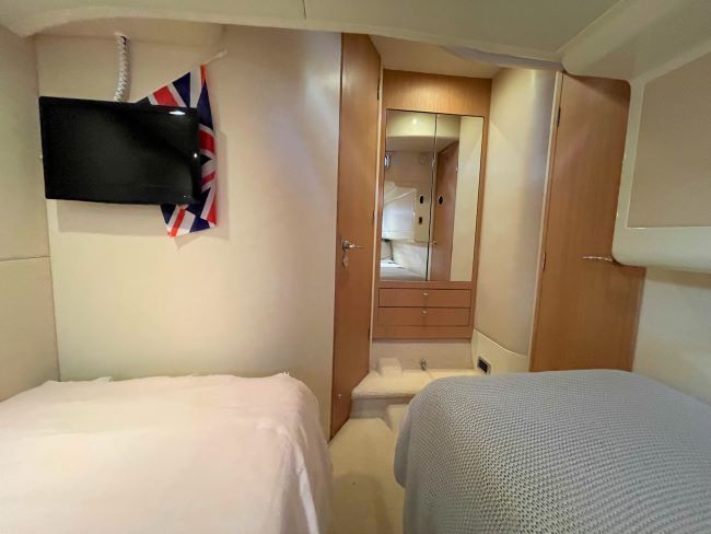 Large aft twin cabin, which can convert to a double as and when required, with plenty of storage, flatscreen TV, JVC radio/CD/DVD player and private en-suite head and shower cubicle.