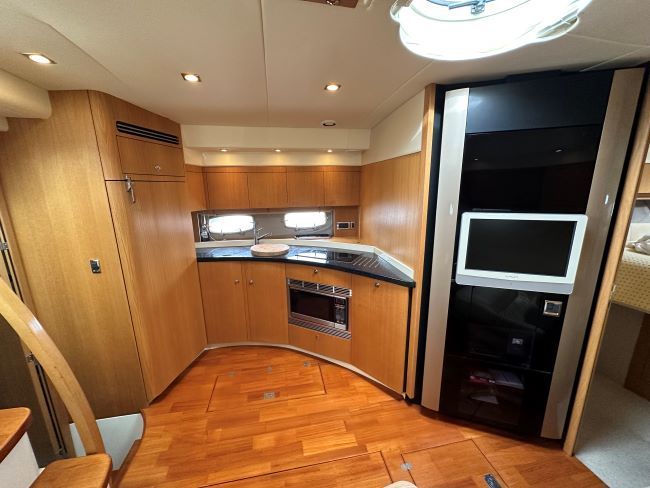 Two burner ceramic Plastimo hob, mcirowave/oven/grill combi, twin stainless steel sinks, tall Isotherm fridge/freezer and Avonite worktops. Teak galley sole and teak venetian blinds.