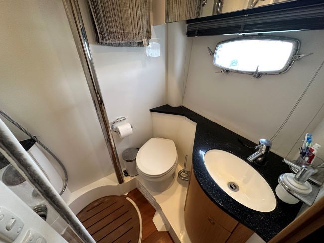 Twin single berth cabin with bedside lights, TV with DVD, mirror doored lockers and en suite heads with electric marine toilet, handbasin set in Avonite and separate shower cubicle, mini venetian blind to porthole.