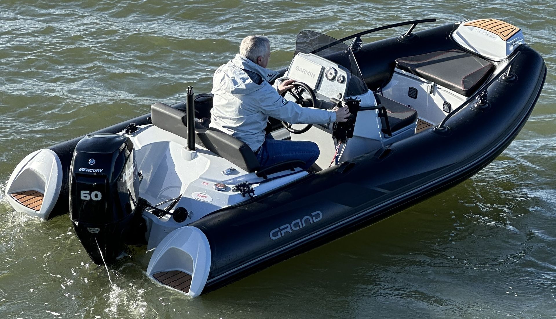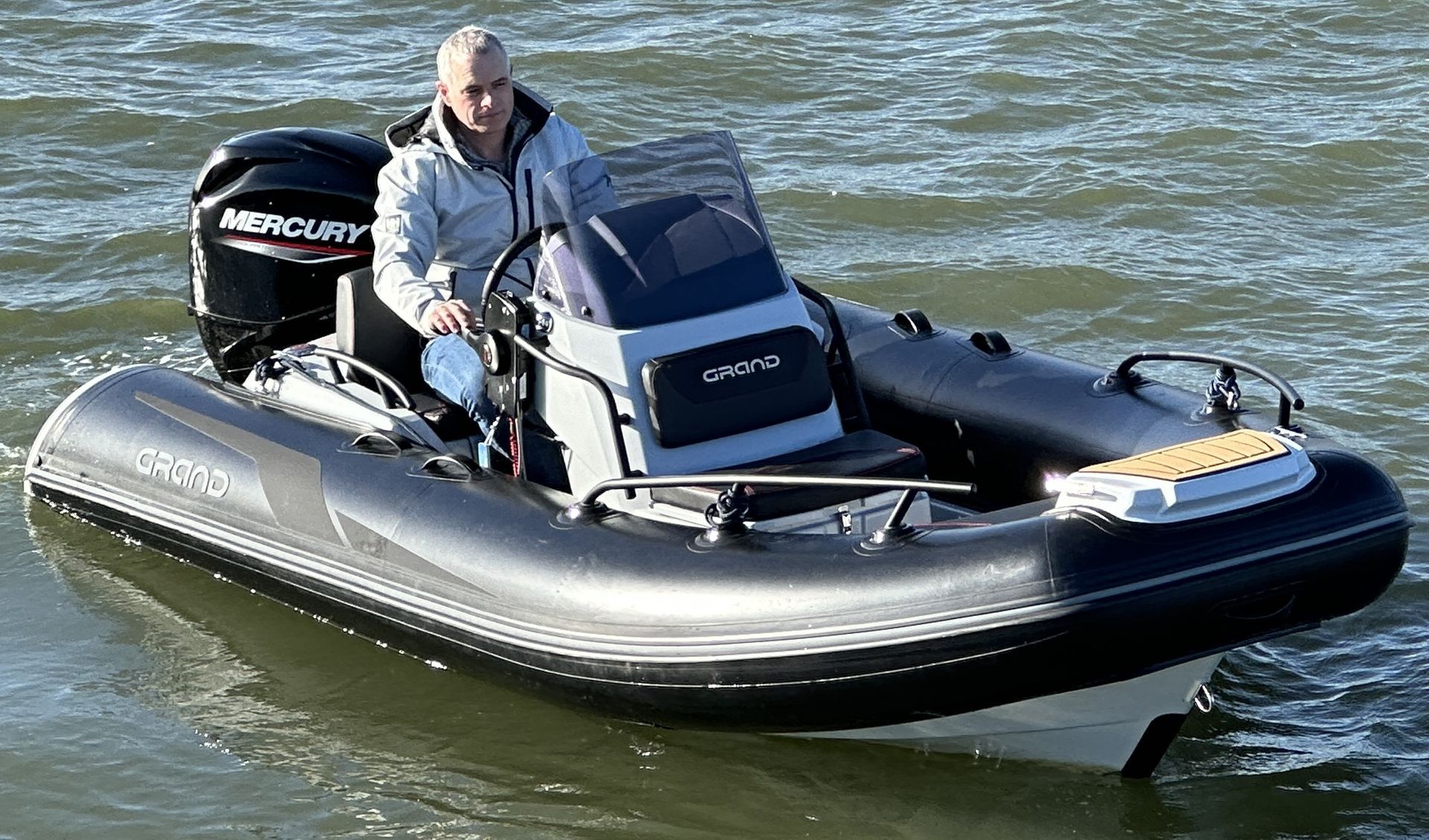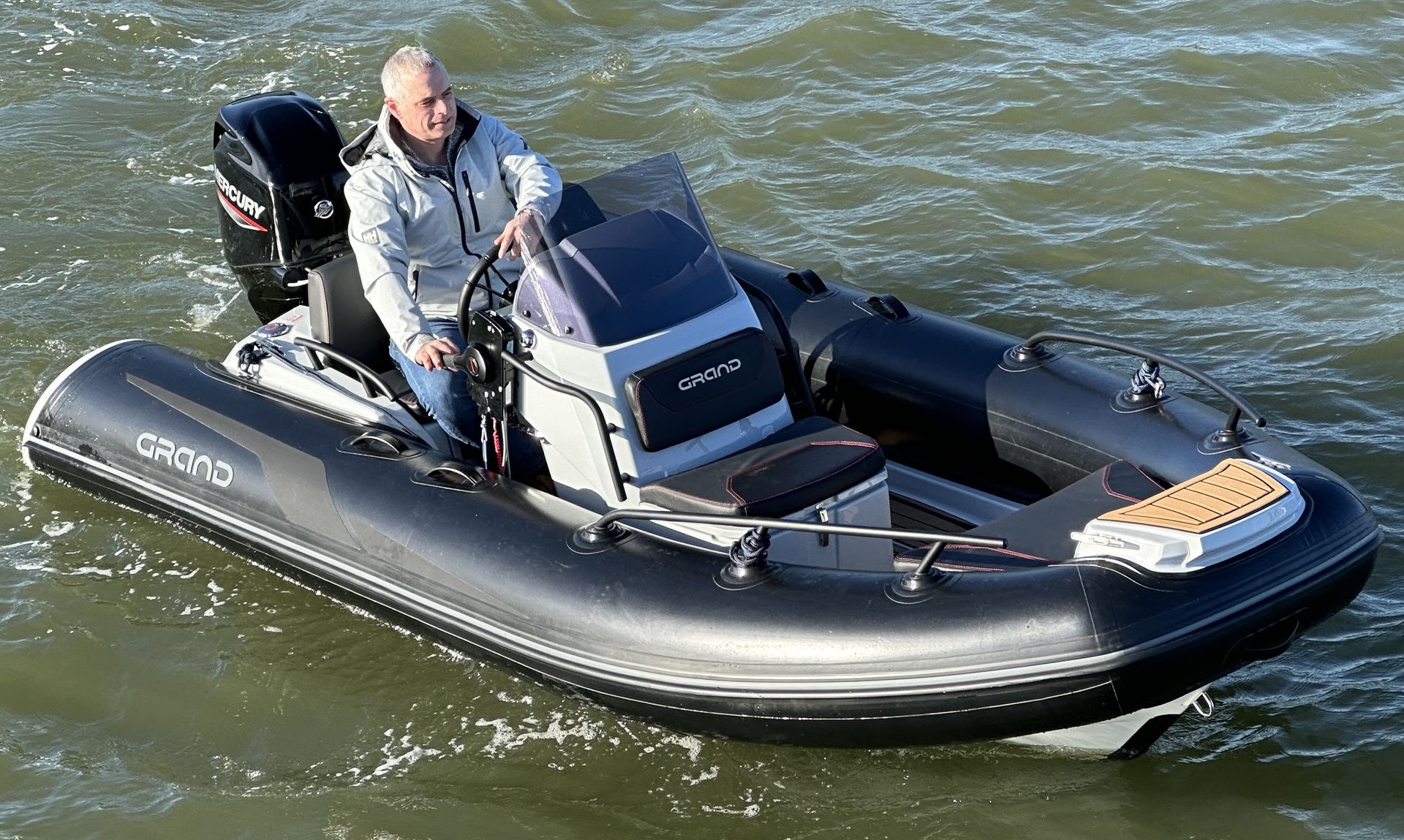 The Grand Golden Line GL420 RIB boasts all the features of a 6m RIB, in a compact and stunning package. This example has the largest engine option, being a Mercury 60hp on the back with a ski pole, bow sundeck kit and its’ huge stern locker and you have the perfect recipe for a family RIB.