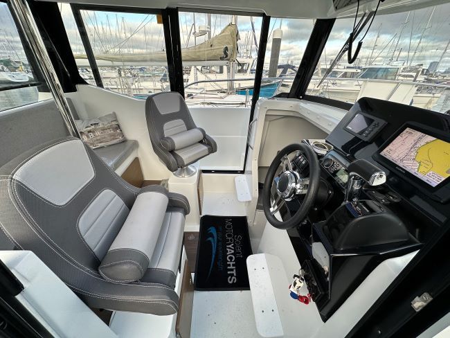 Her proven hull, stable and fast, ensures excellent performance. With her adventurous style, this “SUV of the sea” reveals a great multitude of uses. With twin wide side doors the Merry Fisher 795 Marlin can favour fishing or family cruising in the dry with secure recessed sidedecks for safe and easy passage between the helm station and the cockpit.