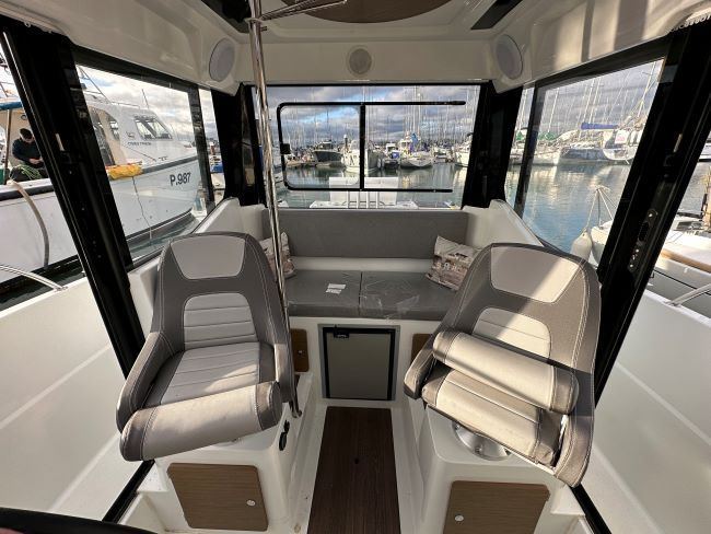In “family outings mode”, the Merry Fisher 795 Marlin combines comfort and shared spaces with a bench seat located just behind the wheelhouse, sheltered from the wind. It faces the comfortable and even larger cockpit saloon, which transforms into a sundeck.