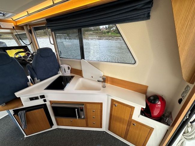 Fully equipped galley to starboard with sink, fridge, diesel hob, combination microwave/convection oven, storage