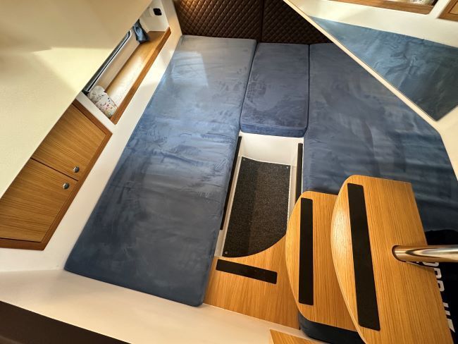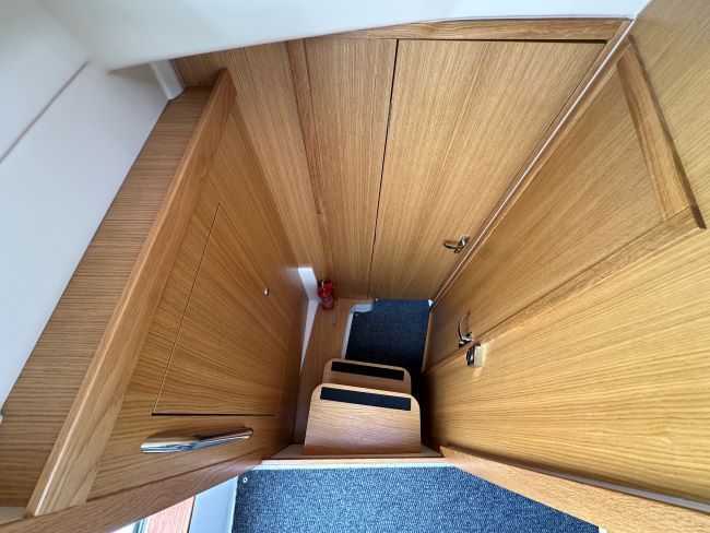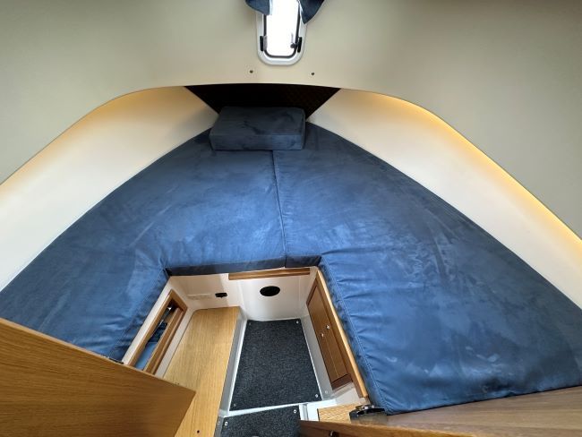 Large forward double berth (or 2 singles if required) with drawers and storage underneath, skylight and opening hatch