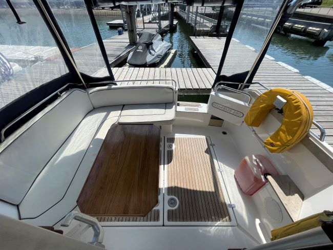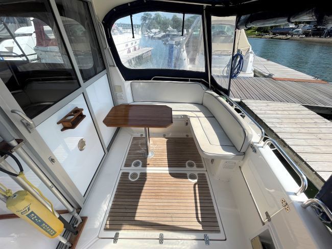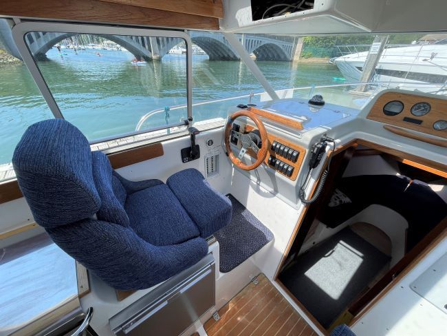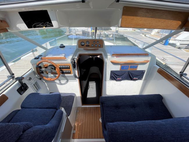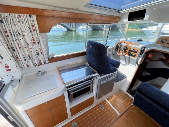Helm seat and galley to Port