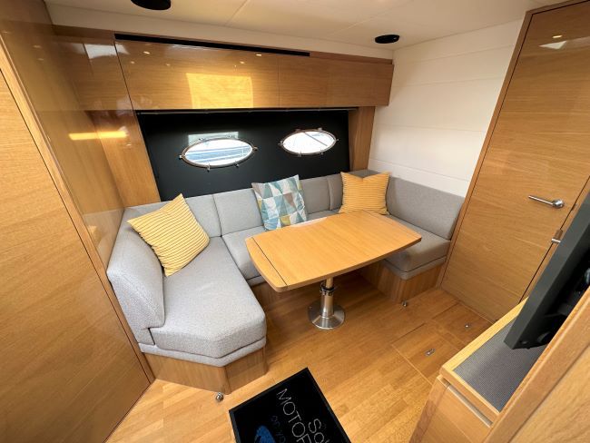 C shaped saloon to port, that drops to form a double berth as and when required, driftwood linen upholstery, opposite a 28” LED TV fitted in saloon linked to Fusion radio/DVD/MP3 player with internal and cockpit speakers, fully equipped galley complete with upgraded ceramic hob and combination oven