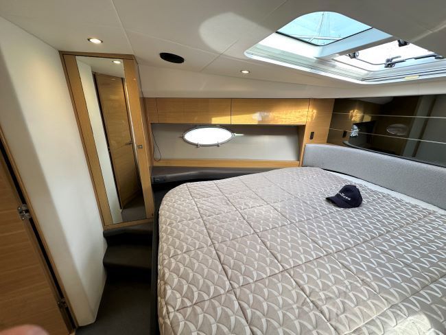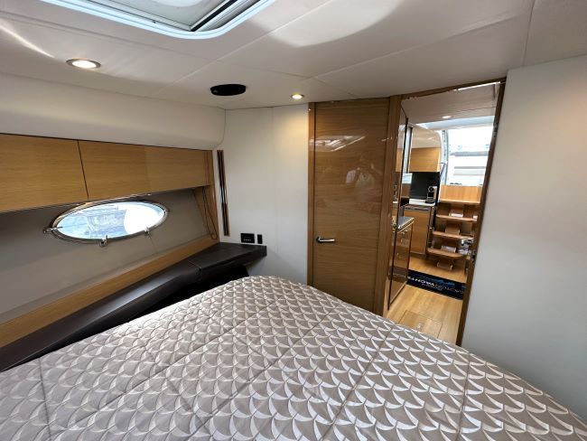 Large forward master cabin with island double with en-suite access to day head, plenty of storage, Fusion radio and twin overhead speakers