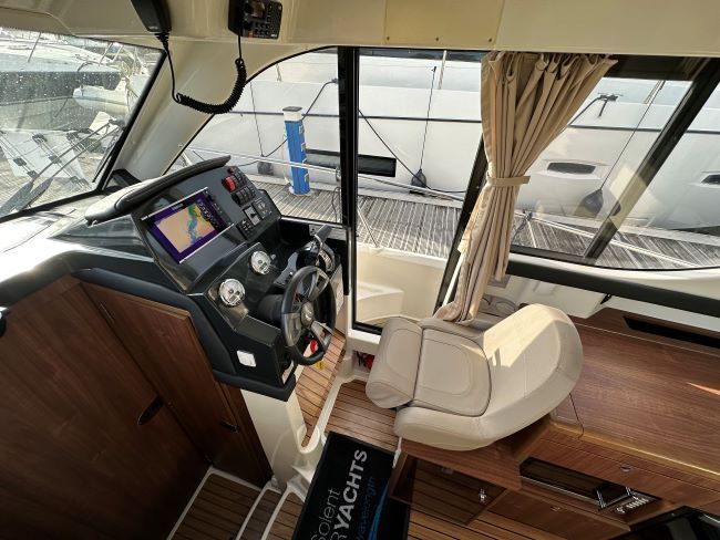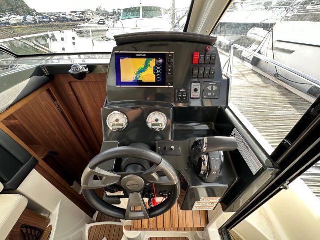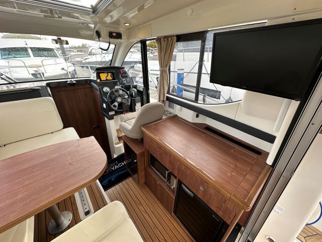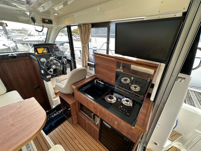 SALOON - The saloon upholstered in cream leatherette has a modern and spacious feel and is fitted with an adjustable helm seat to starboard which offers excellent all-round visibility, and a door to the side deck for easy access when mooring. Aft of the helm is a linear galley equipped with a 2-burner gas hob, microwave, fridge, sink with cutting board, and storage.