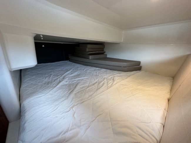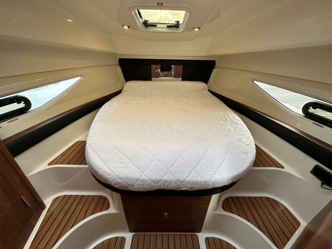 FORE CABIN - Featuring an island double berth fitted with an upgraded luxury mattress, easily accessed beneath berth stowage, wardrobe, opening hatch to foredeck, mirror, LCD TV, and a space-saving sliding door.