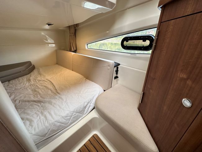 AFT CABIN – A large double berth with an upgraded luxury mattress is located to port and runs beneath the wheelhouse sole, and has a seat, wardrobe, and storage.