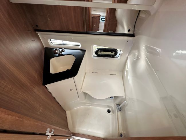 HEADS - Separate heads compartment to starboard with a marine toilet, shower seat, washbasin, shower, mirror, cupboards, and opening port light.