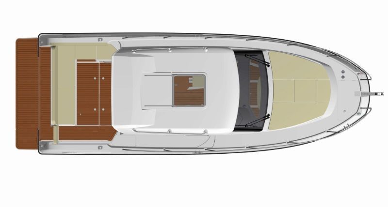 EXTERIOR - The aft cockpit features an adaptable layout with a large sliding bench seat, allowing either the bathing platform or cockpit to be increased in size when required, and offers comfortable seating for 6+ adults. A large table cockpit table is included which can drop to form an aft sunpad, a smaller teak table and foredeck sunpad cushions are also included. The teak-laid cockpit and aft bathing platform, fitted vinyl cockpit cushions, and full cockpit enclosure with integrated bimini, combine to give a feeling of luxury, whilst the asymmetric deck design and walk-through stern door to the bathing platform allow for easy deck access. Good storage is provided by easily accessed lockers beneath the seating, and is complimented by a large lazarette and fender baskets. Stainless steel grabrails, handles and wheelhouse roof-mounted rails assist with safe access to and from the foredeck.