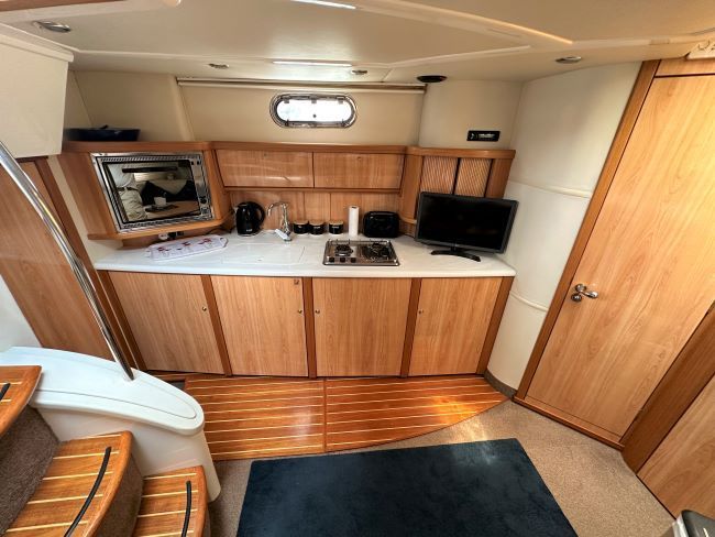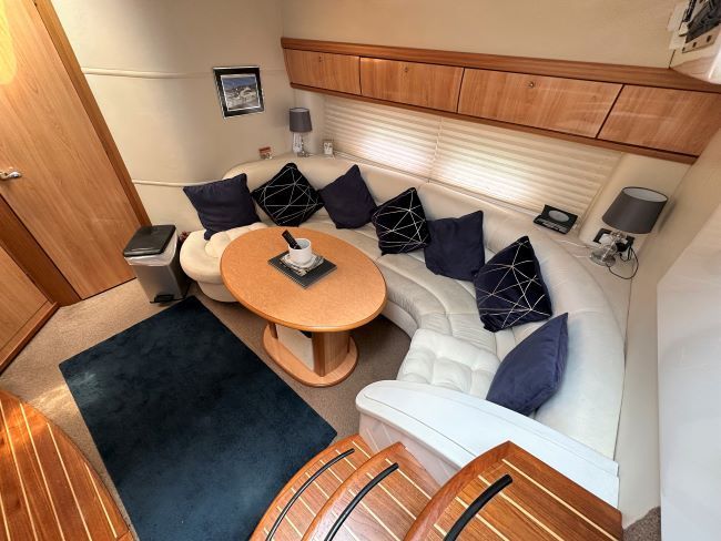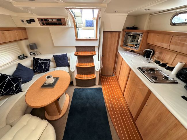Large saloon seating to starboard upholstered in cream leatherette (with double berth conversion) opposite the fully-equipped galley with microwave/combi oven, gas oven and grill, 3 ring gas hob, large fridge and plenty of storage.