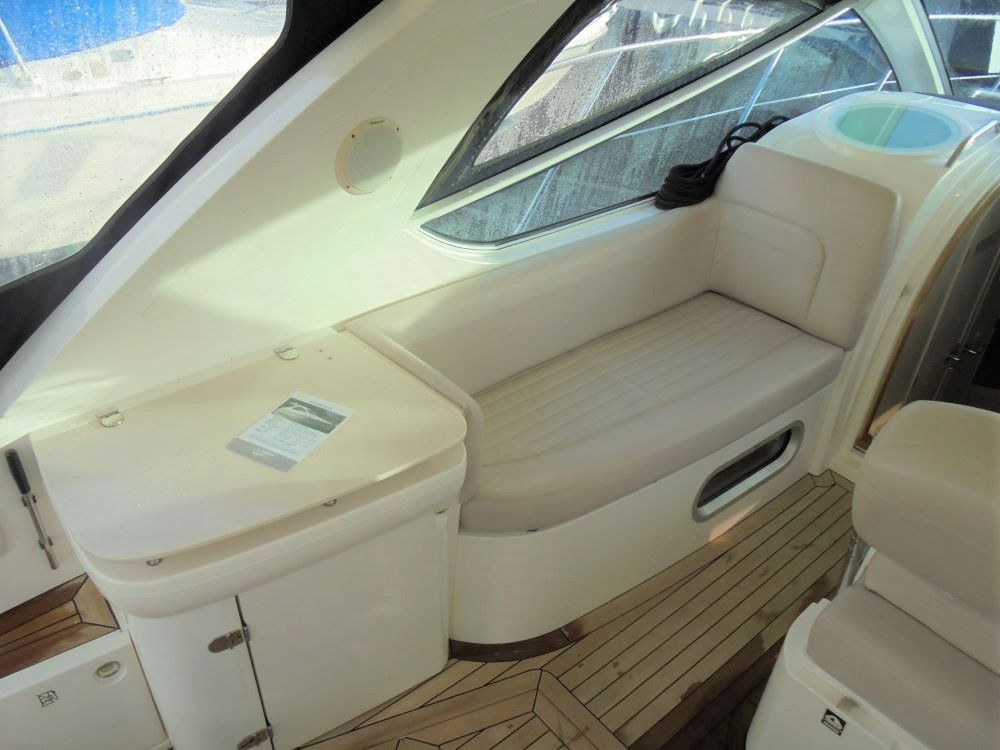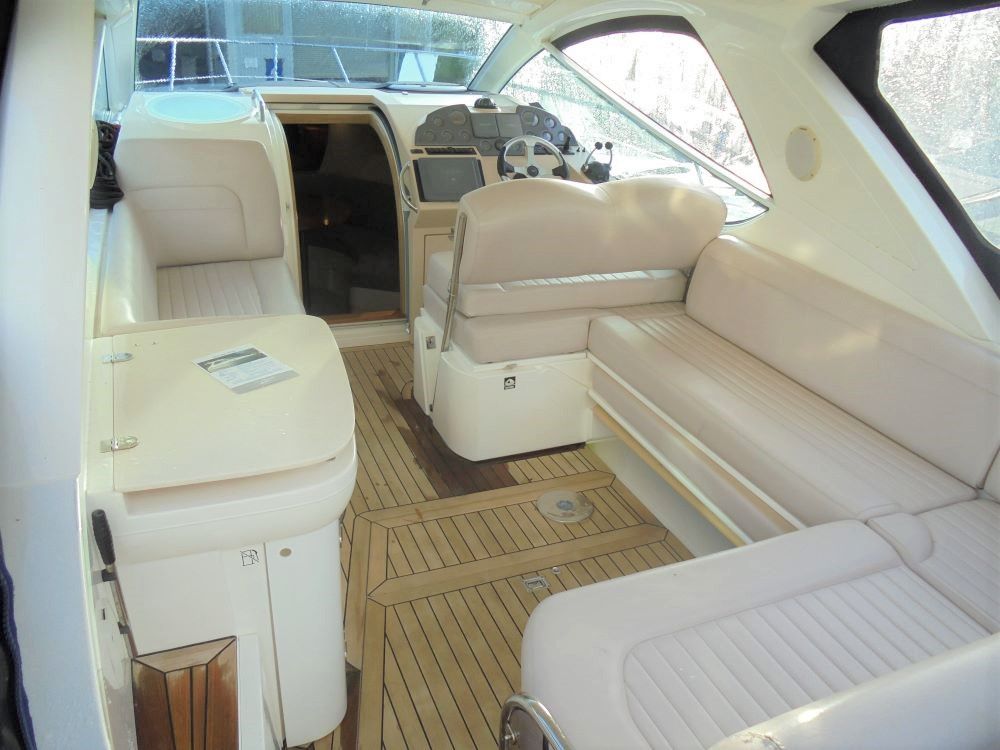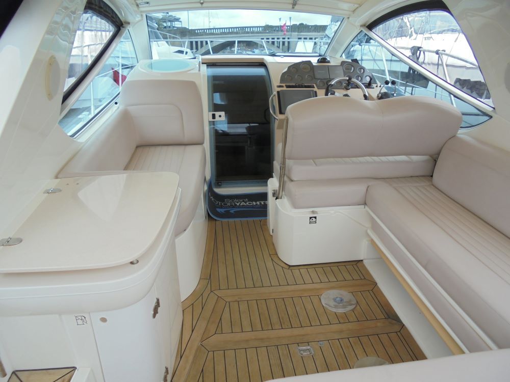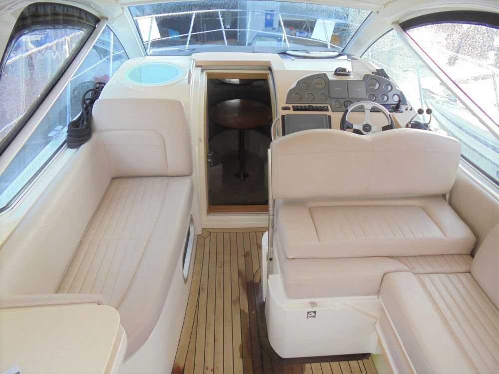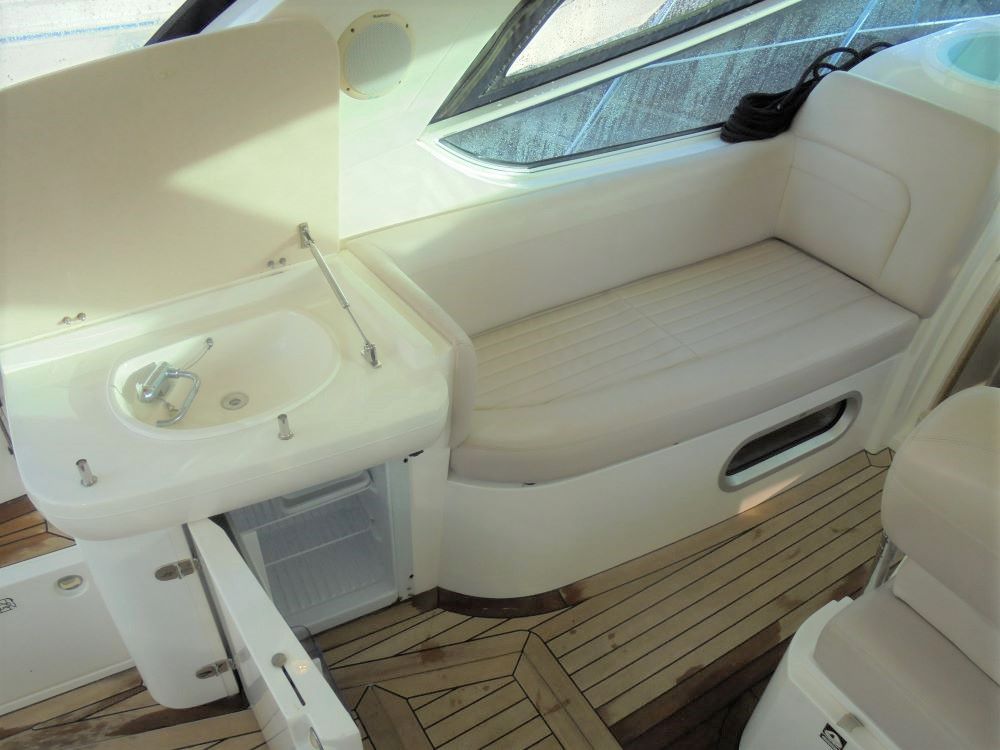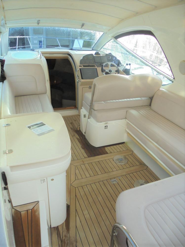COCKPIT: twin helm seat, L-shaped seating area which converts to sunpad, cockpit table with designated storage, cockpit sink and fridge, hot/cold transom shower.