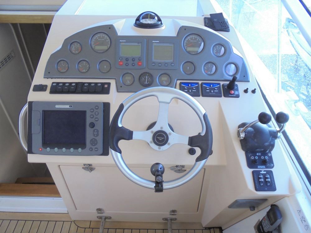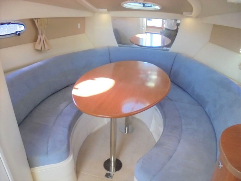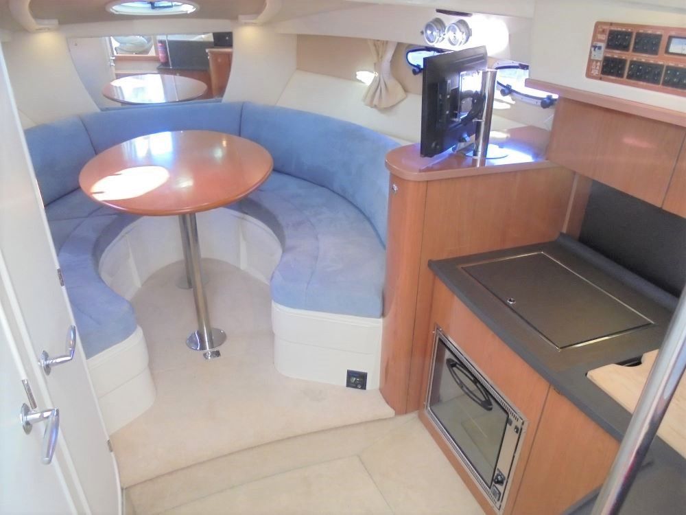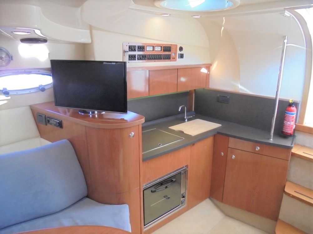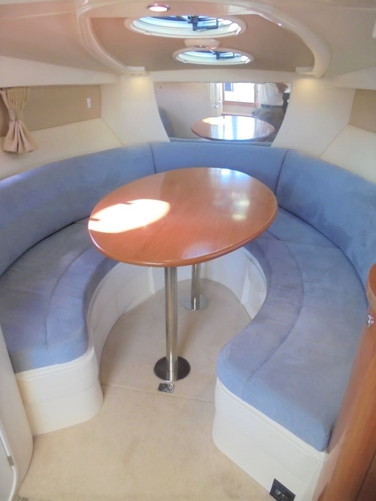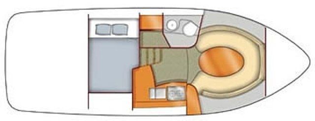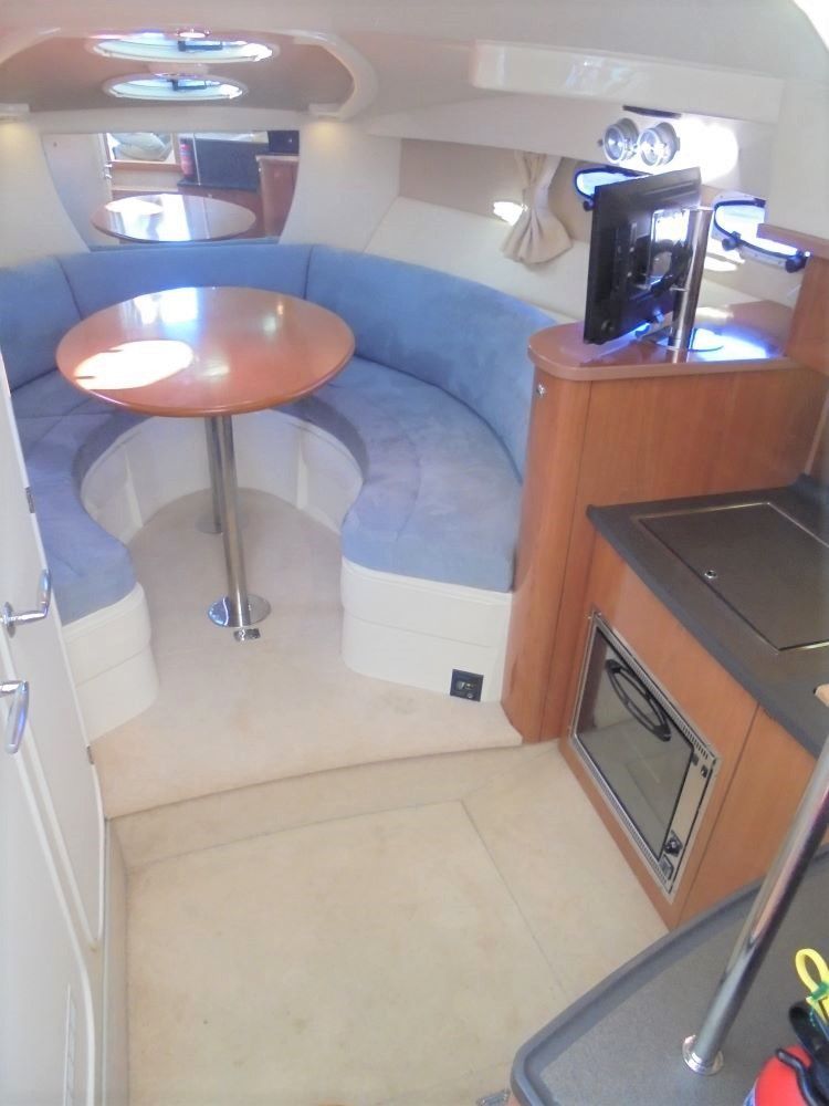 COCKPIT: twin helm seat, L-shaped seating area which converts to sunpad, cockpit table with designated storage, cockpit sink and fridge, hot/cold transom shower.