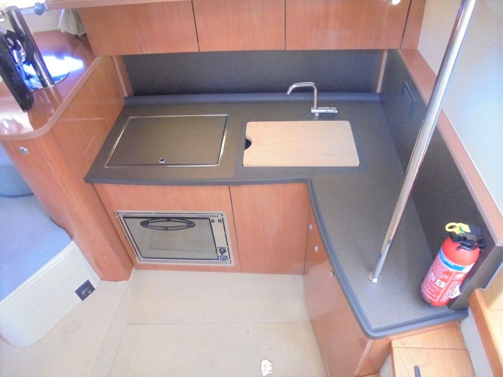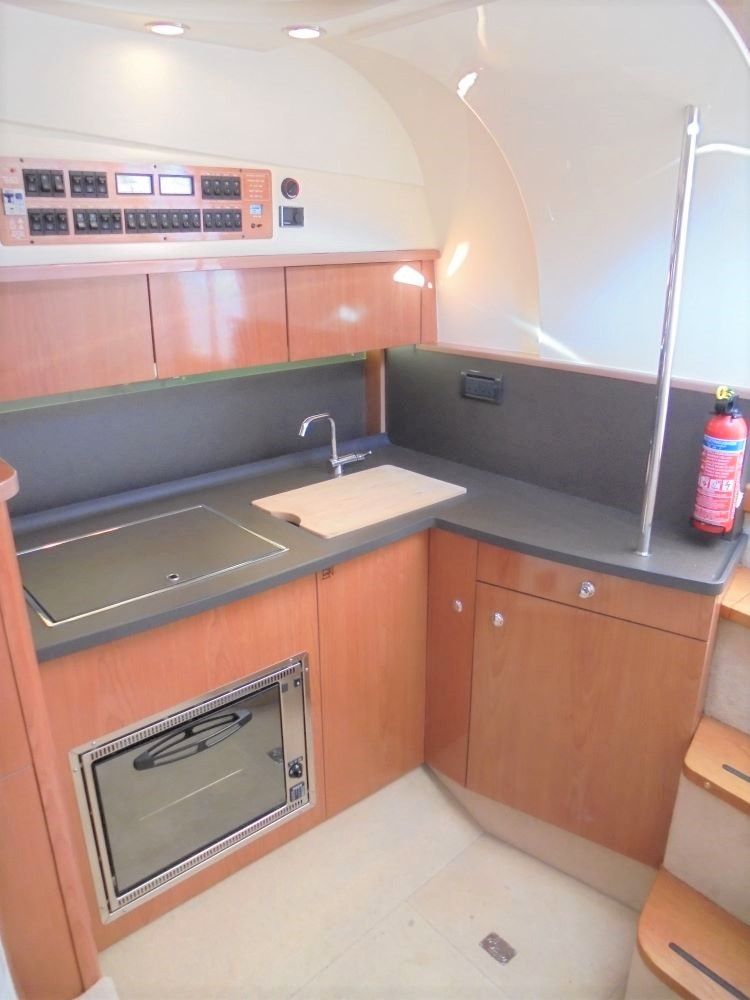 GALLEY: to starboard with twin gas hob & over with grill, fridge, double stainless steel sink and plenty of storage