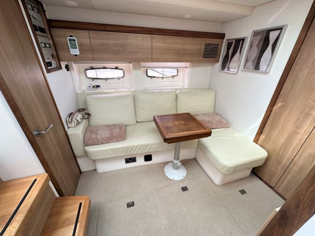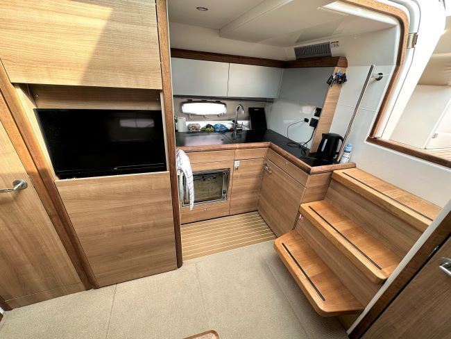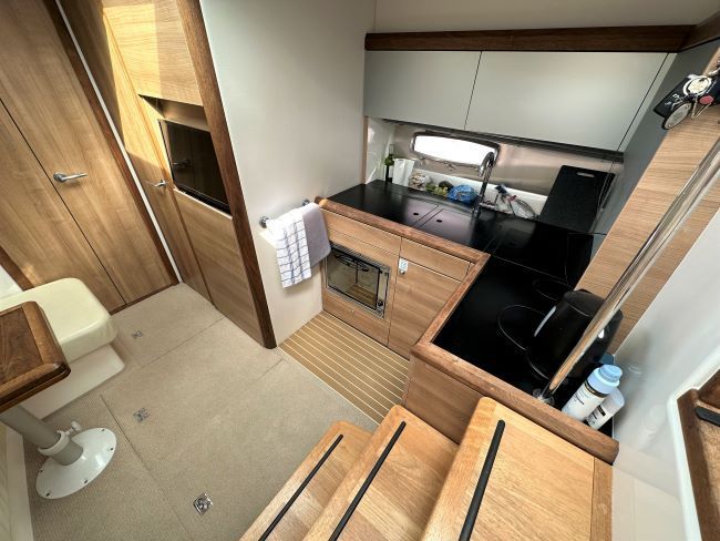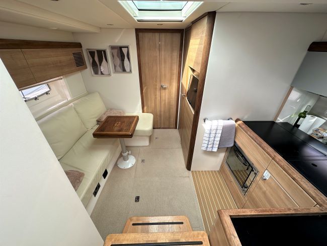 Comfortable L-shaped saloon to port with fully-equipped galley to starboard