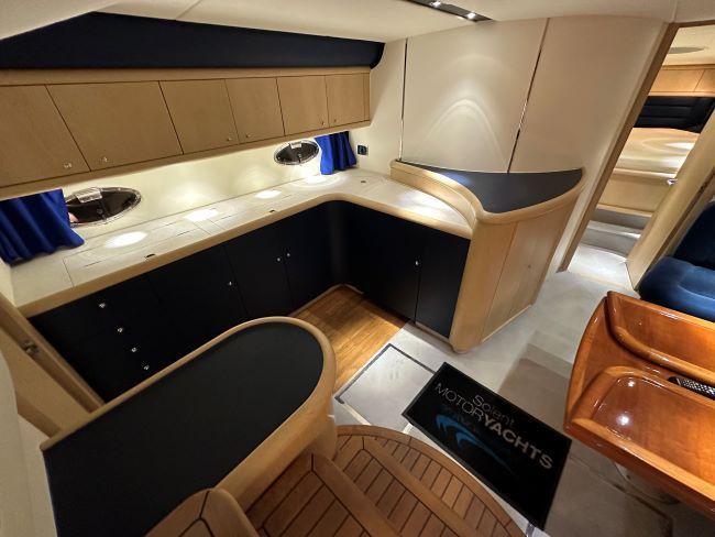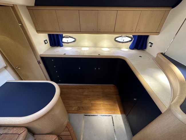 Large saloon/dinette to starboard with storage and TV opposite a comprehensively equipped galley to port.
