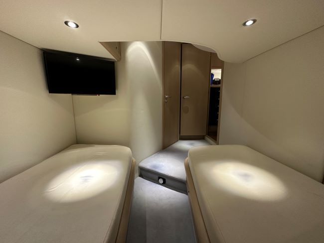 Twin berth guest cabin, aft of saloon, with TV and private ensuite toilet with separate shower compartment.
