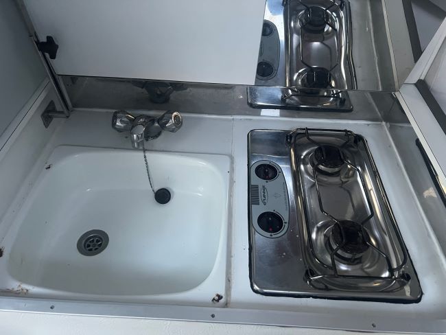 Single alcohol/electric hob, s/s sink, 2 drawer and cupboards on port side