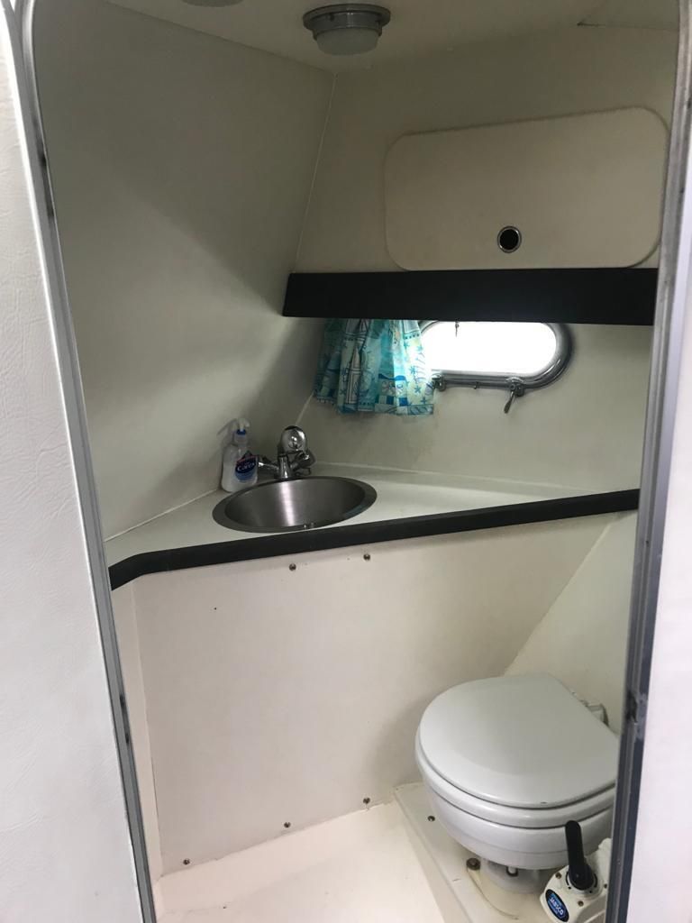 Heads, with manual Jabsco sea toilet and shower on Port side with s/s sink