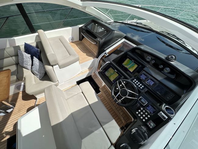 Upgraded cockpit AV system with Fusion MS-AV750 head unit, Fusion NRX200i remote on dashboard, 4x 7” Fusion speakers, 5ch amplifier and 10” subwoofer