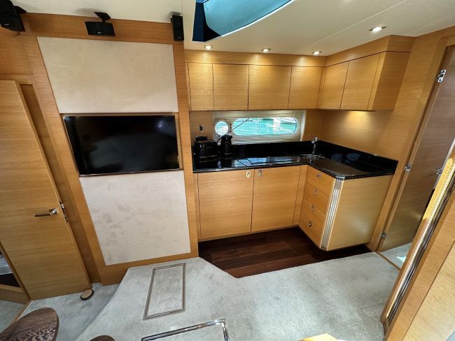 Fully equipped galley to port with plenty of cupboard storage space, microwave oven, fridge/freezer, large stainless steel sink and electric ceramic hob.