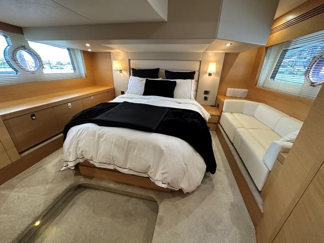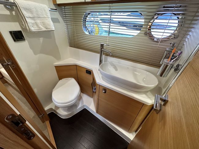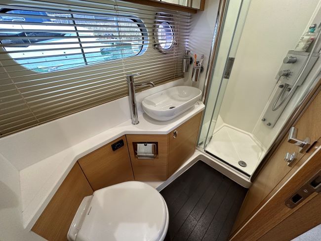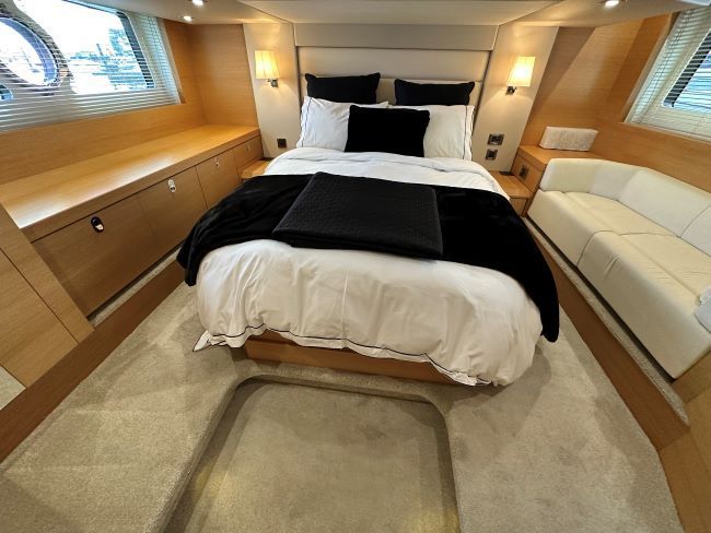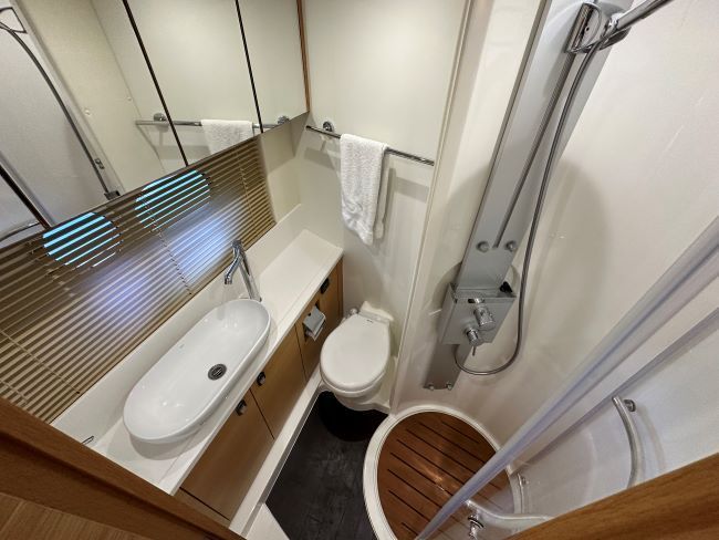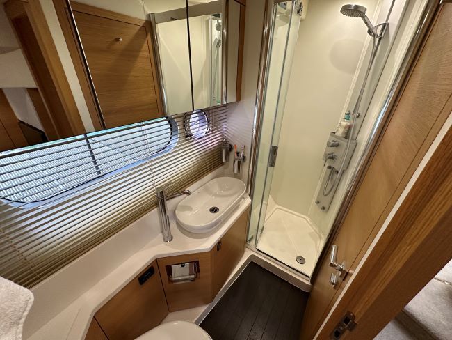Midships full-beam master cabin with large centreline island double berth, linear sofa to port, a good sized wardrobe, plus linear sideboard to starboard side of bed, making light work of extended time onboard. En-suite access to day head comprising of a separate shower cubicle, plus electric fresh water flush toilet and hand basin