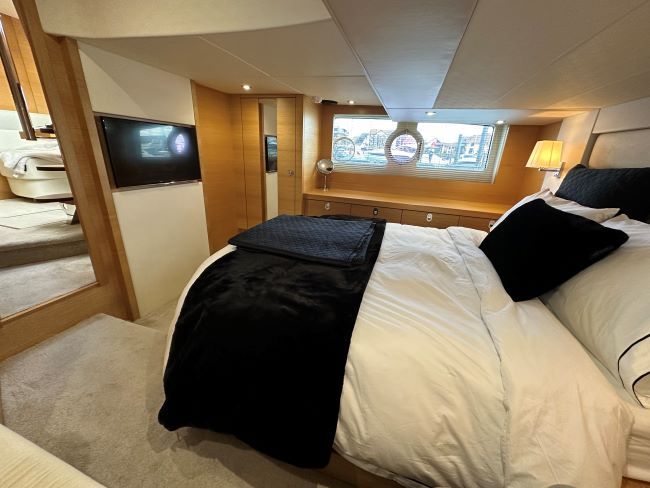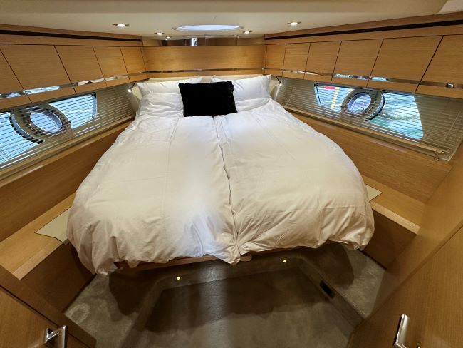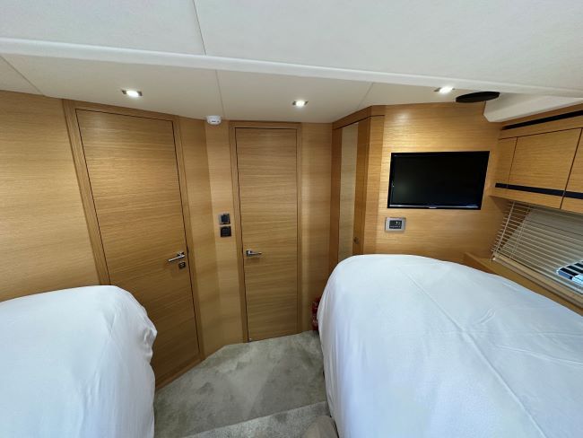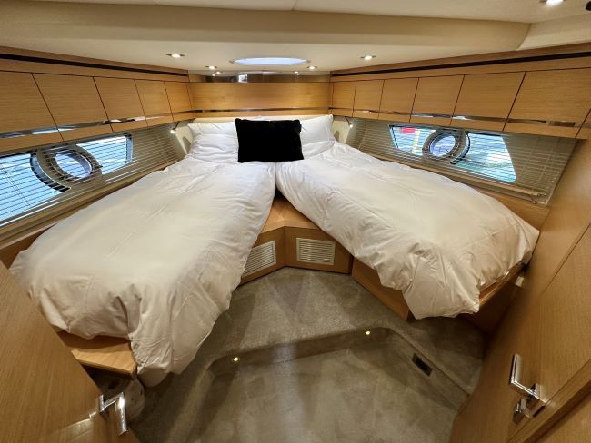 VIP forward guest cabin with centreline scissor-type berth arrangement, offering either two singles or a large double as required. Hanging locker plus high-level cupboards either side of bed. Direct access to en-suite heads compartment with shower stall, fresh water flush toilet and hand basin.